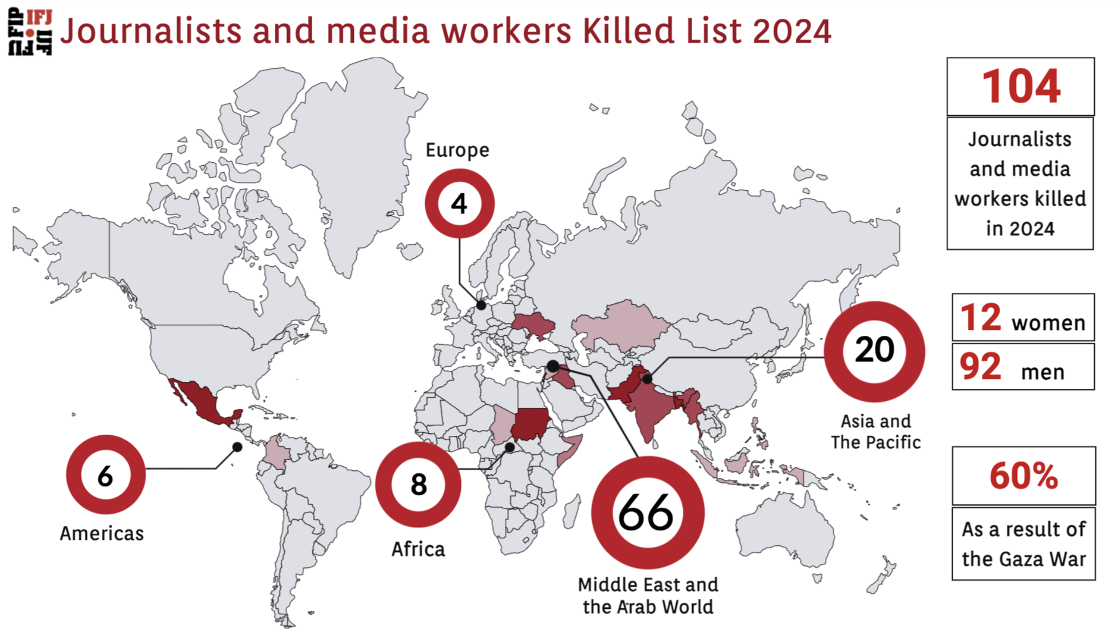 As of 10 December 2024, 104 journalists had been killed worldwide, more than half of them in Gaza, Palestine (55). The IFJ reaffirms its determination to see an International Convention for the Protection of Journalists adopted by the United Nations as a matter of urgency.