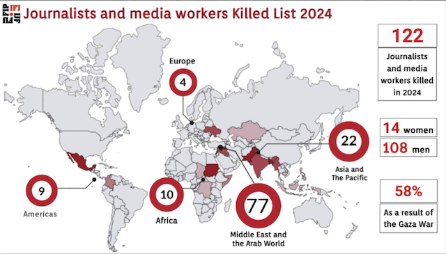 One hundred and twenty-two journalists and media workers, including 14 women, were killed last year, according to the International Federation of Journalists’ Killed List for 2024.