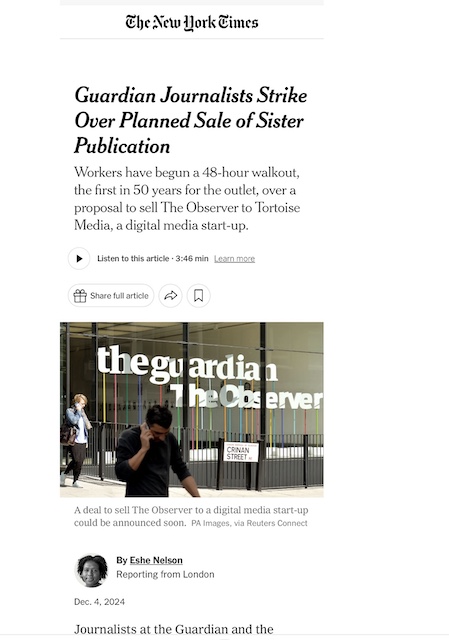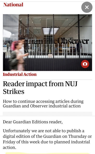 Meanwhile, the Guardian informed readers its digital edition was unable to be published due to the lack of journalists and its front page contained no staff bylines, making the NUJ-backed strike apparent to readers.