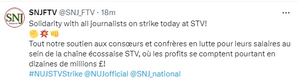 #STV is a brilliant news provider. Its journalists deserve pay that keeps pace with inflation. Shame on the company that their pay offer is so poor – full solidarity with colleagues who are striking today. #NUJSTVStrike Tim Dawson, deputy general secretary the International Federation of Journalists