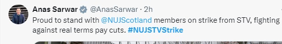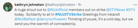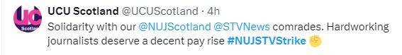 "Solidarity with NUJ members striking at STV in their fight for fair pay. Sending support to you all on the picket line!" Natasha Hirst, NUJ president