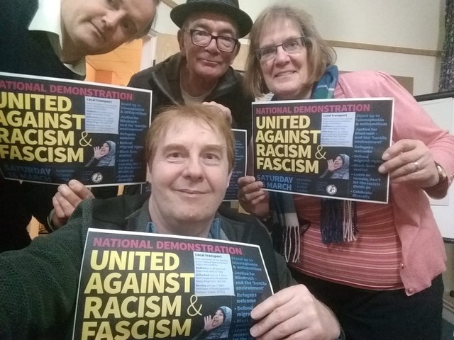 Michele supporting a Stand Up To Racism national demonstration, with South Yorkshire branch members Alan Yearsley (left), Phil Turner and John Quinn (front)