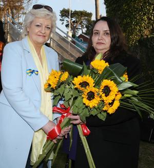 ICTU General Secretary Patricia King presents the Ukraine ambassador Larysa Gerasko with a bouquet of sunflowers.